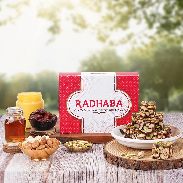 A perfect Indian healthy sugar-free sweet, which is a unique blend of a variety of roasted dry fruits in Radhaba organic Desi Cow Ghee. Dryfruit Punch-Dates is a premium sweet from Gujarat. It is also a healthy snack option as it is rich in vitamins and nutrients.